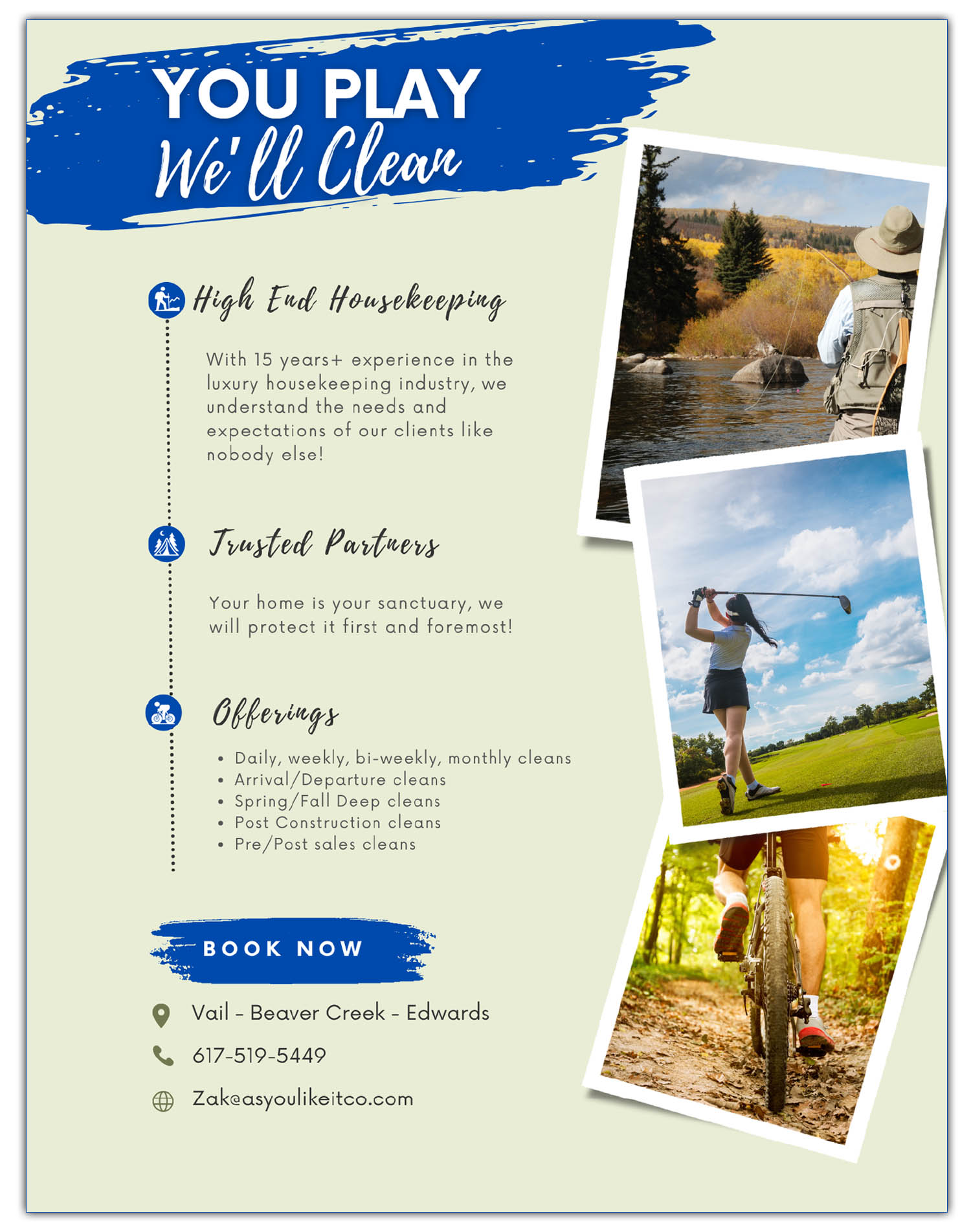Zak brings a wealth of hospitality experience to AsYouLikeIt , whose five-star, onsite property management offerings includes individually customized services such as housekeeping, linen cleaning, yard and building maintenance, transportation, pre-arrival grocery shopping and more.